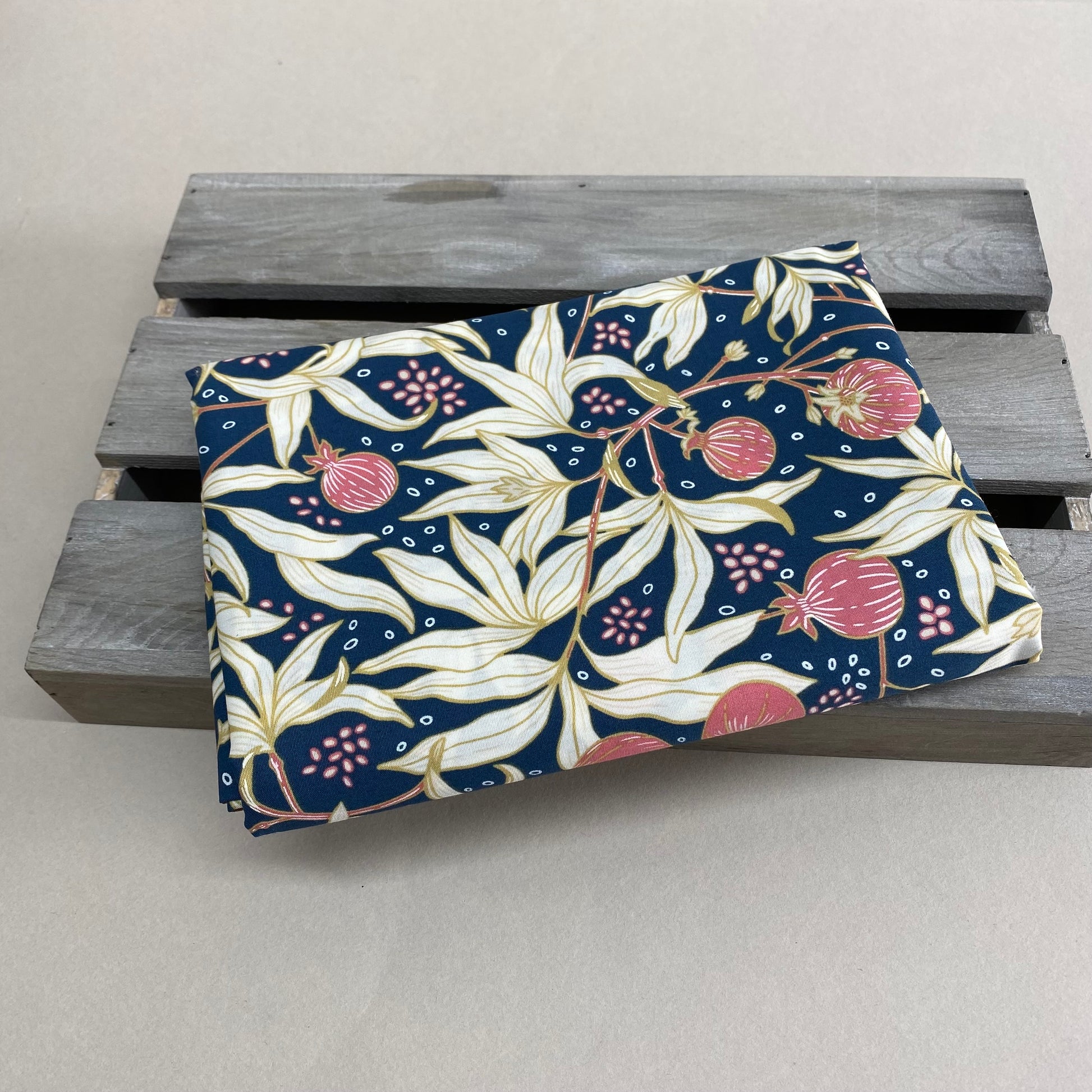 Dancing Pomegranates is a stylised petal print in tones of deep pink, green and ivory on a warm deep blue background. From the Spring Equinox collection by Katie O'Shea, this collection was inspired by nature’s promise of new beginnings This stunning print would really complement a deep autumn or winter complexion.
