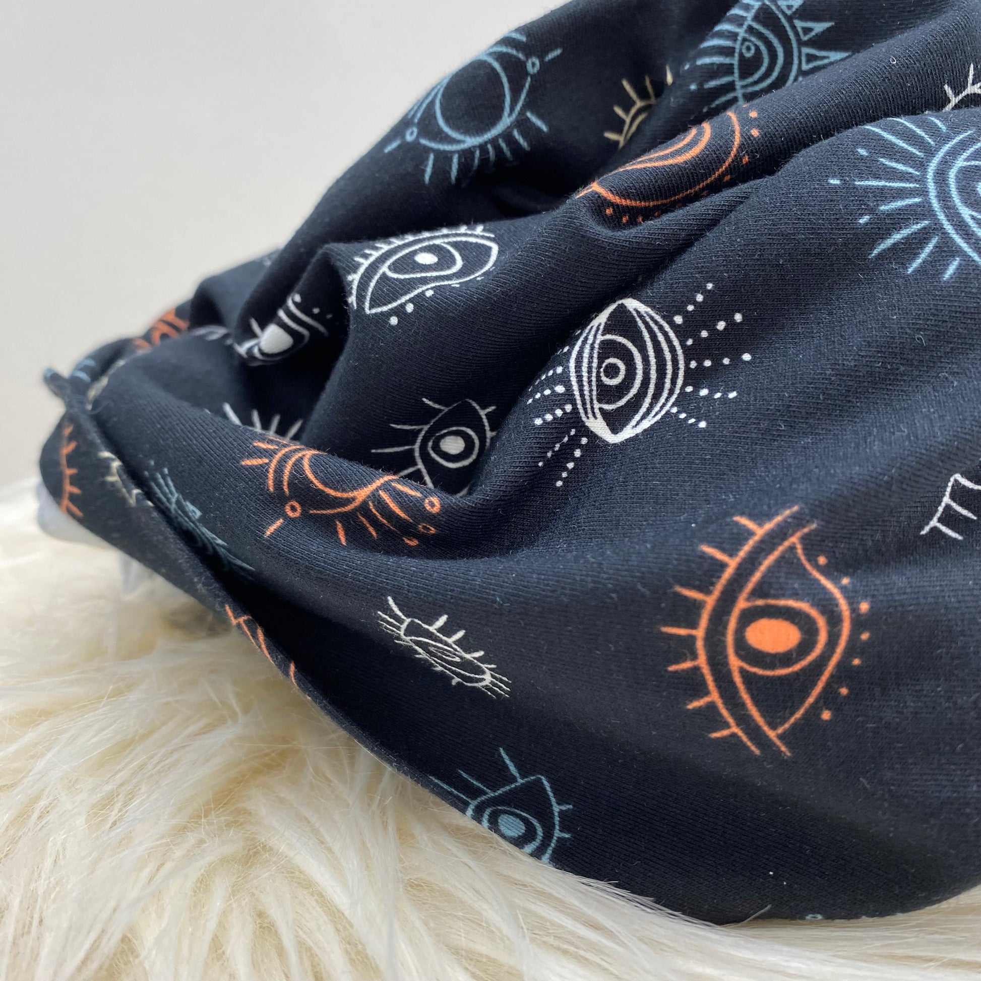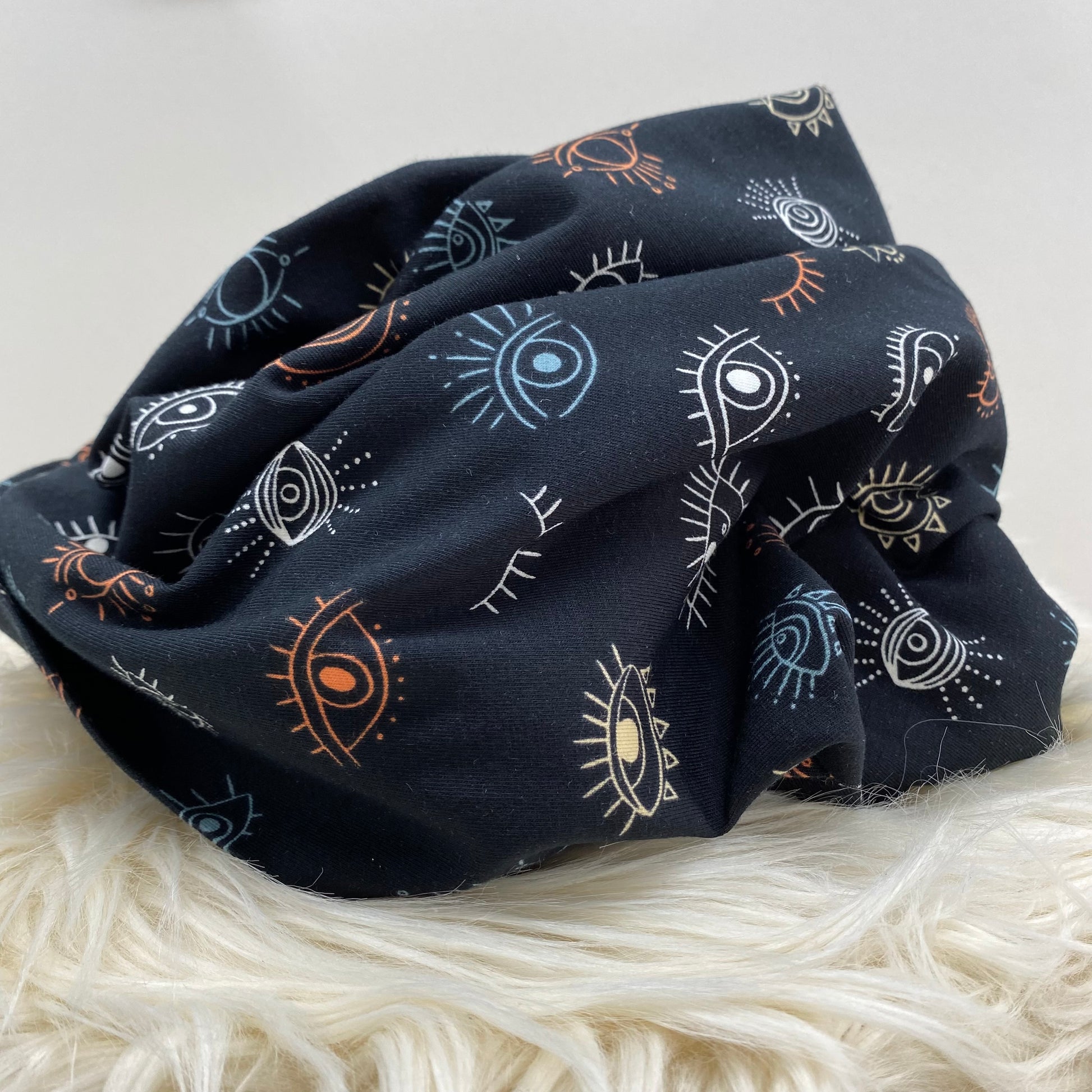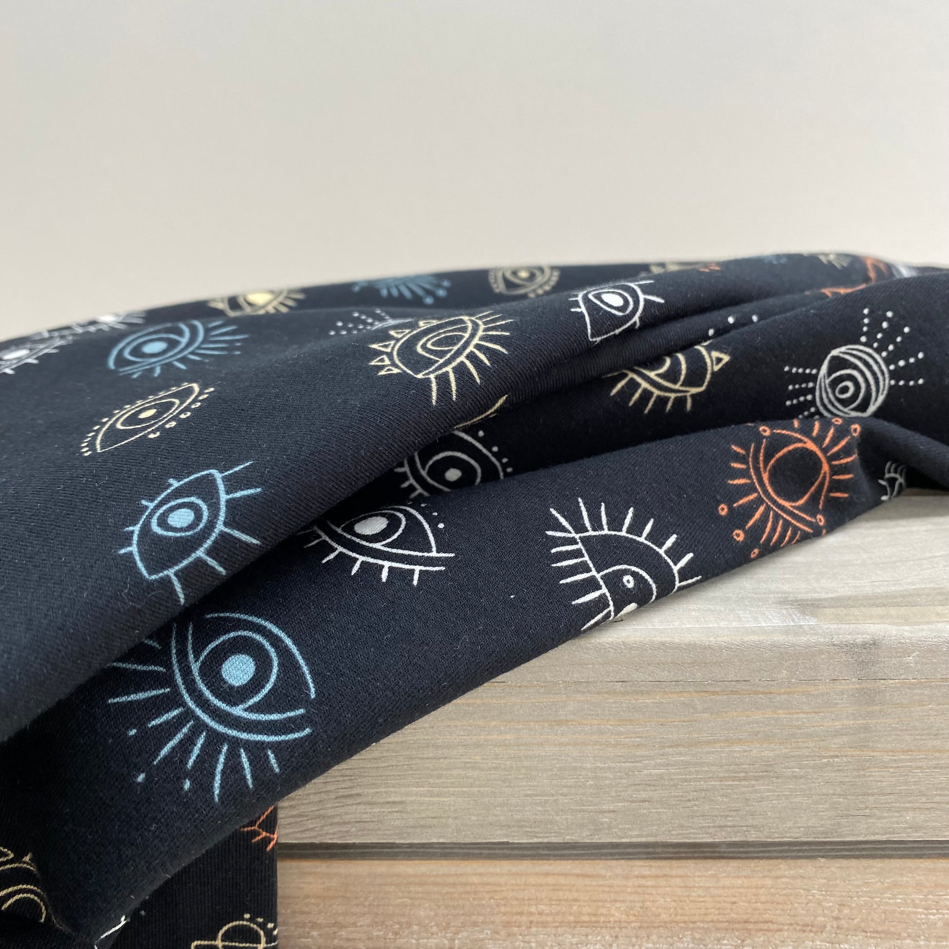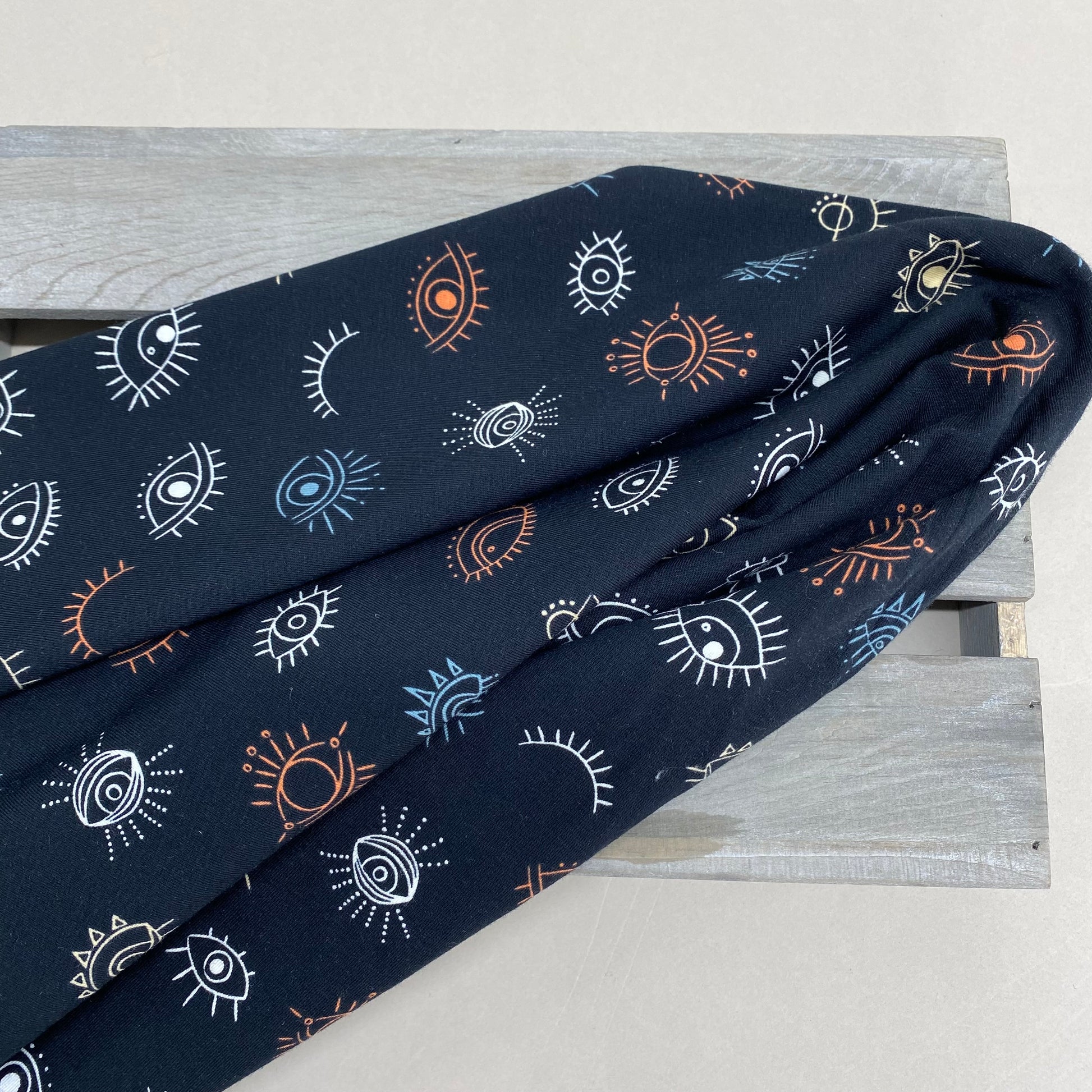 From the mystical inspired Luna & Laurel collection, Eye See You Night is a contemporary print on a dark night background accented with teal, cinnamon and warm white. These mid-warm tones would suit autumn complexions best.