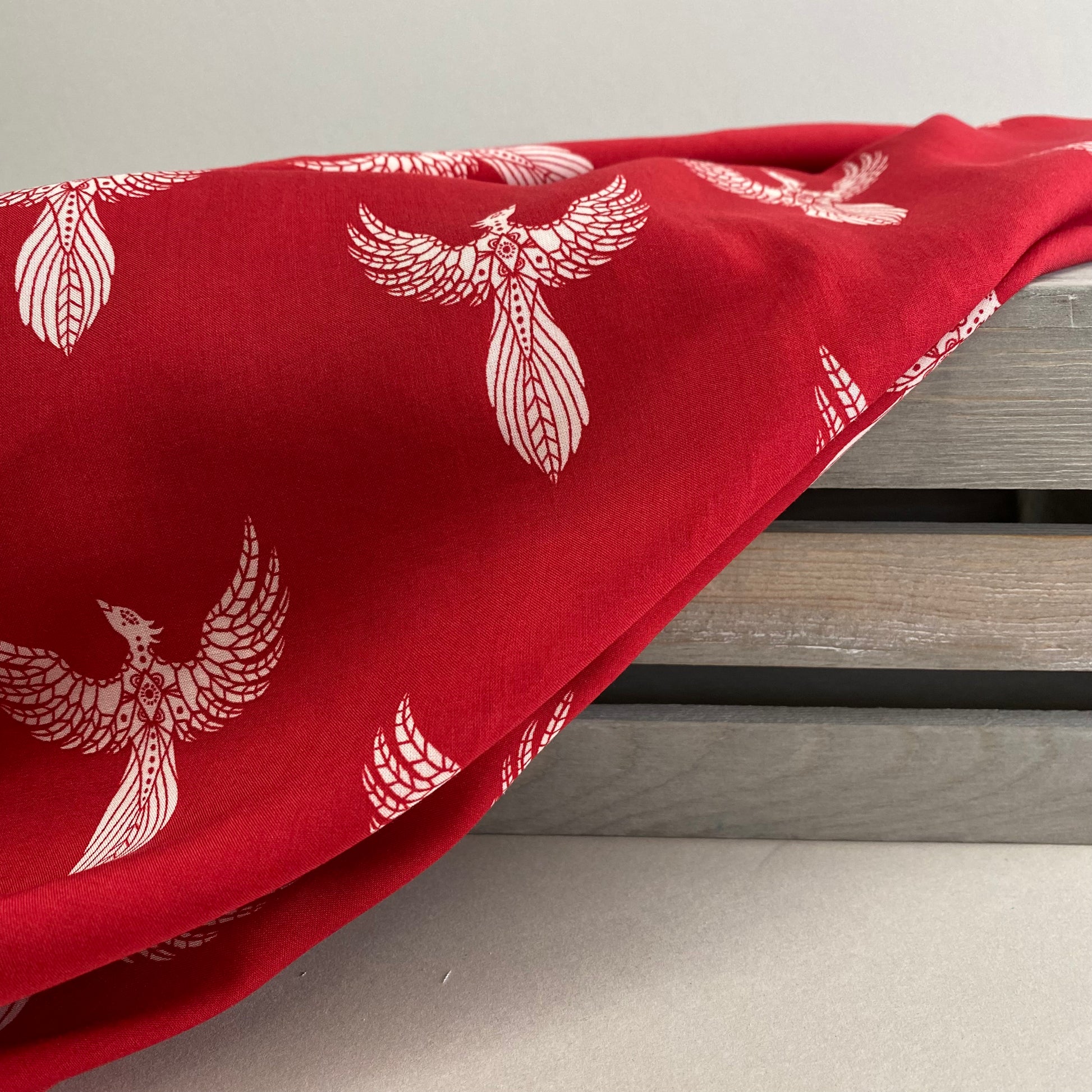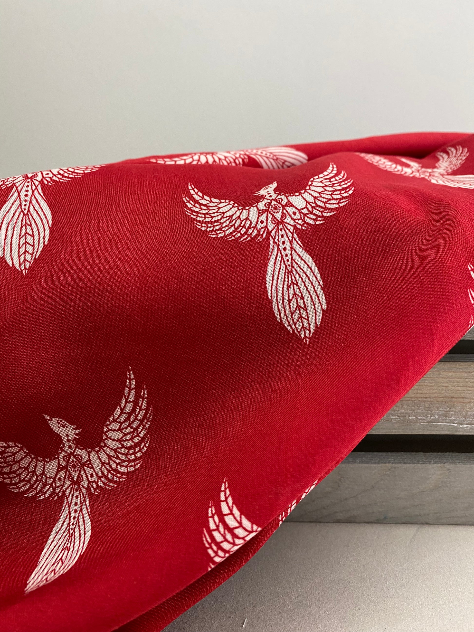 A stylised phoenix design on a scarlet red background. This soft, fluid, 100% viscose challis is the perfect shade for autumn and winter complexions.