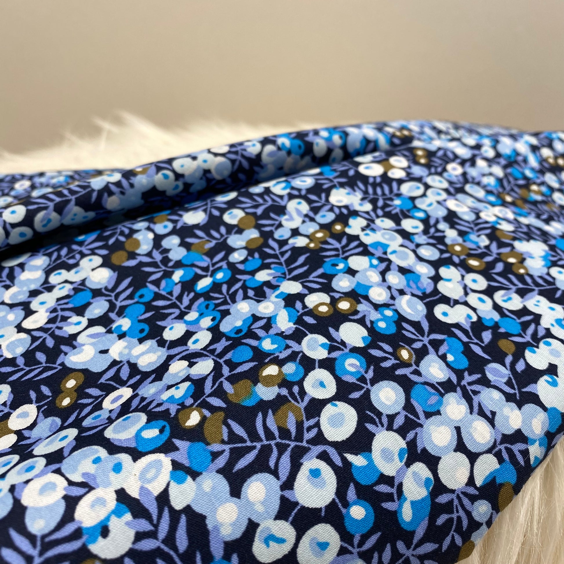 A classic Wiltshire print of berry sprigs in vibrant and soft blues on a navy background.