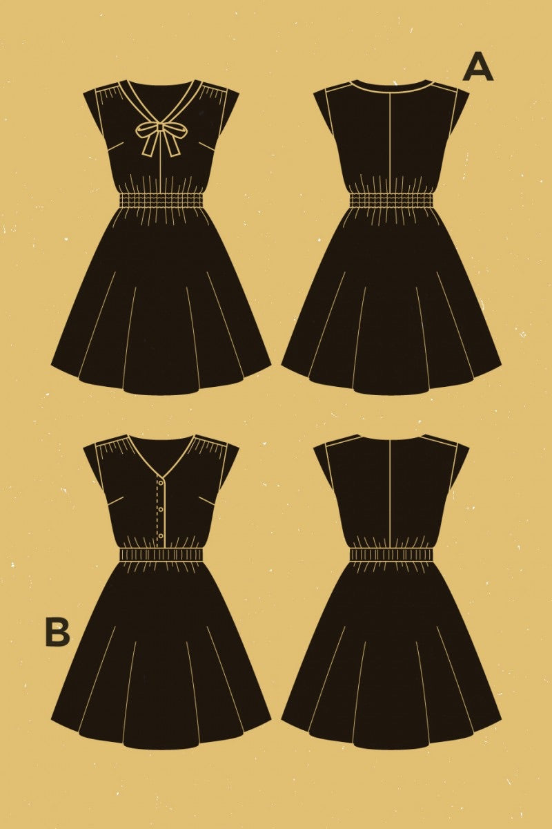 Elasticated-waist sundress with bias-cut bodice, cap sleeves, and shoulder yokes. Version A features a neck bow, version B a mock button front.