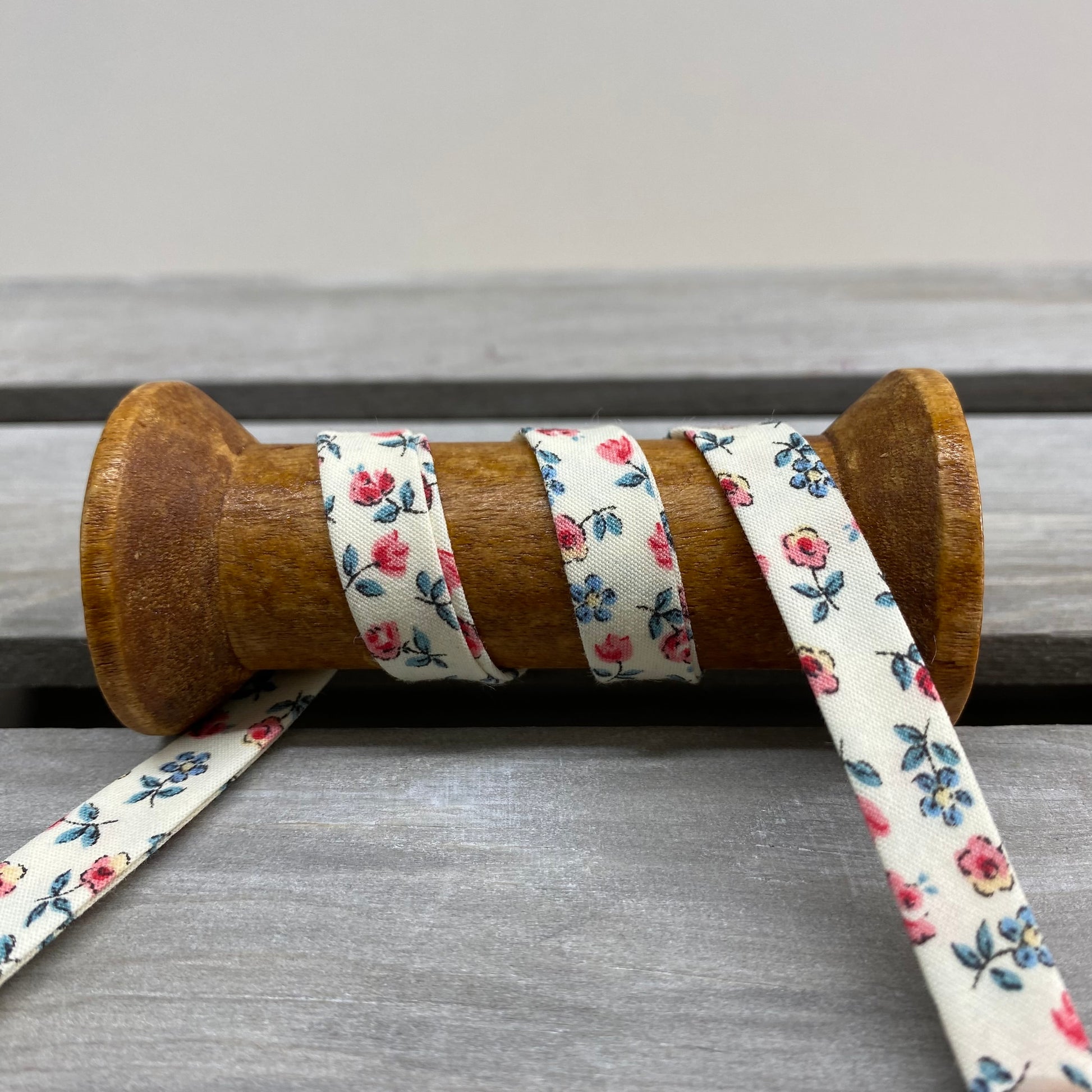 Stunning quality cotton bias binding with pretty floral motif on a cream background. Pre-folded for ease of use. Perfect for all dressmaking, interior and accessory projects.