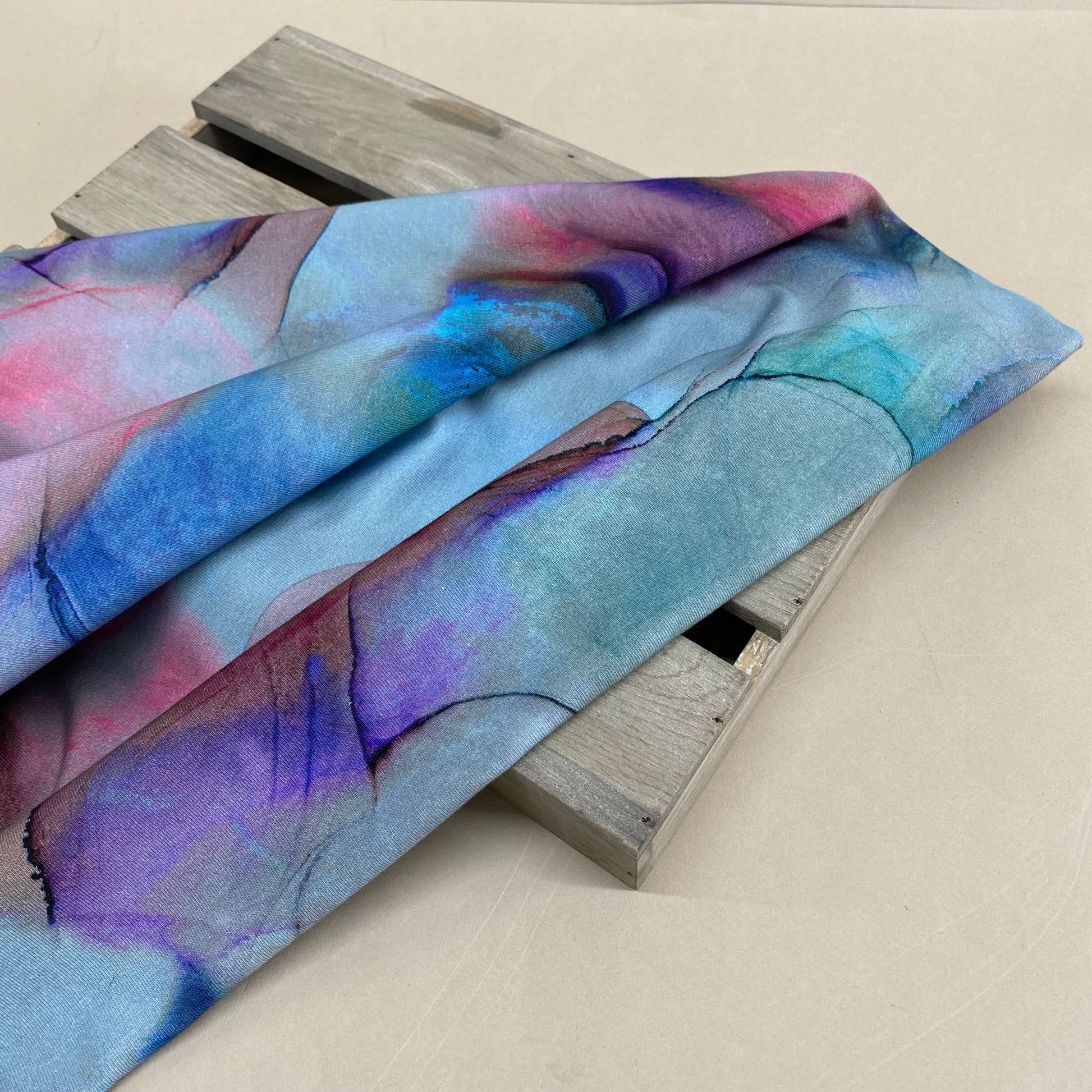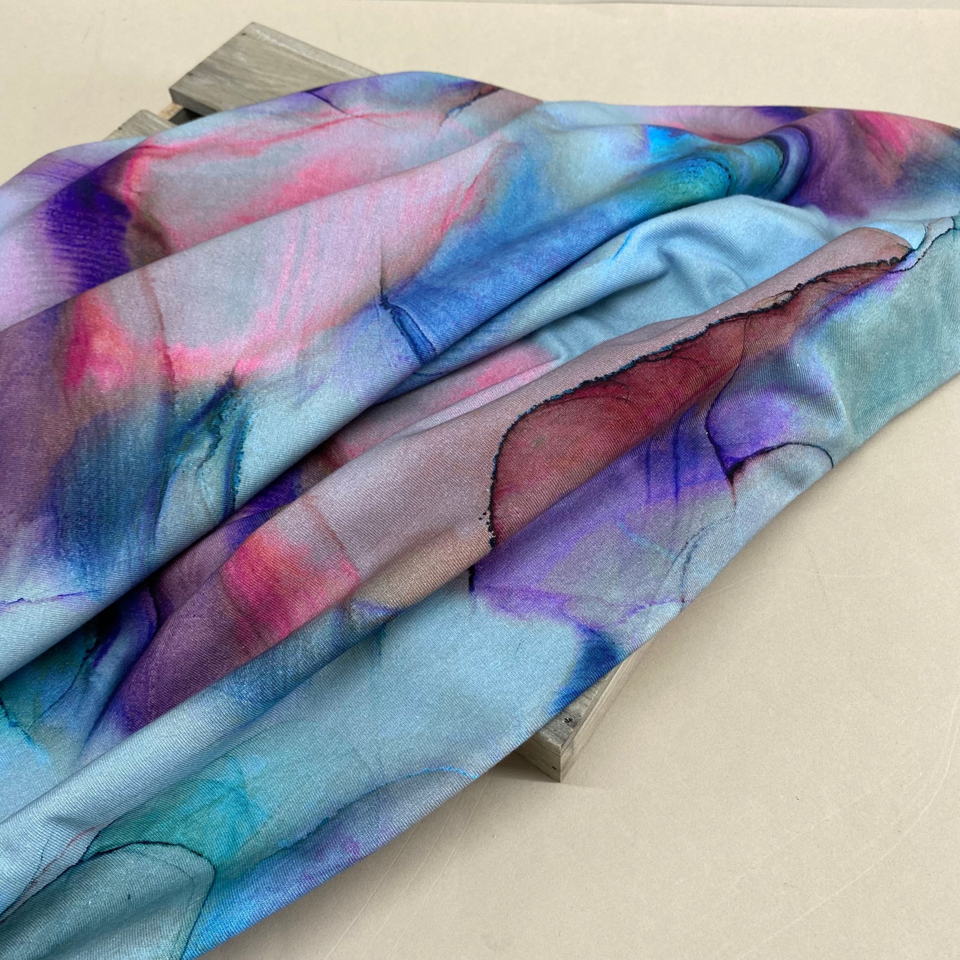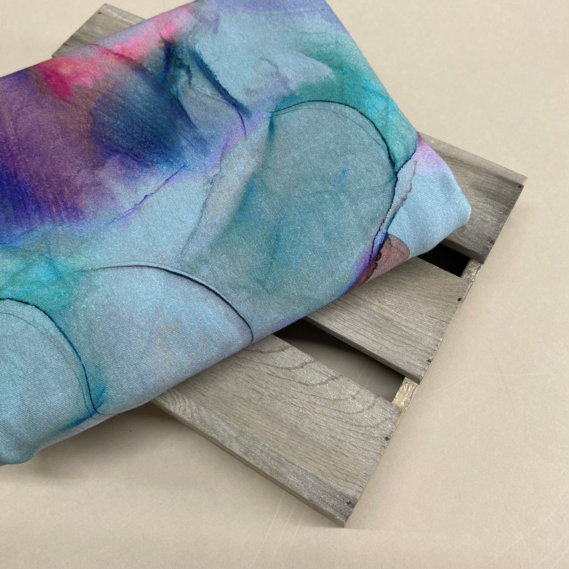 This lovely viscose jersey has abstract palm and blossom patterns on a deep bright blue background. The fabric is super soft with a gorgeous drape and would be perfect for simple t-shirts or a pretty wrap dress.