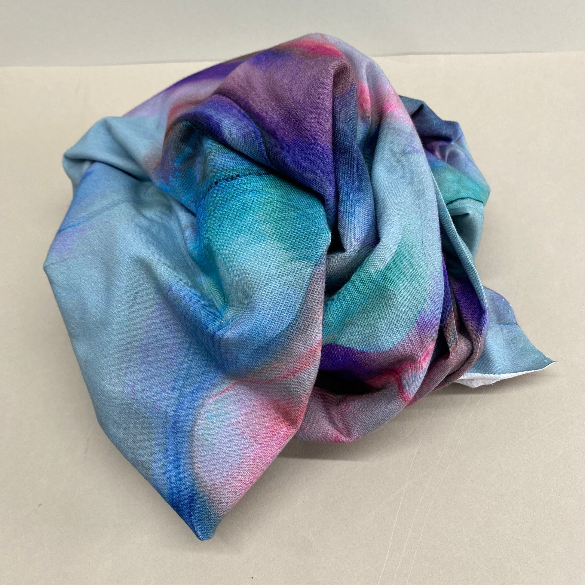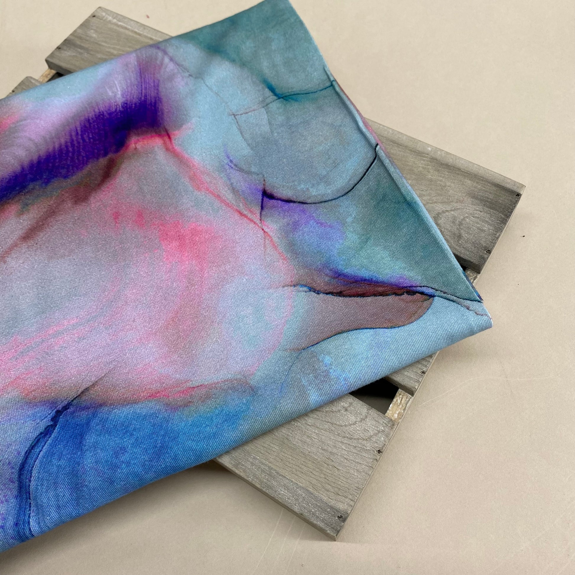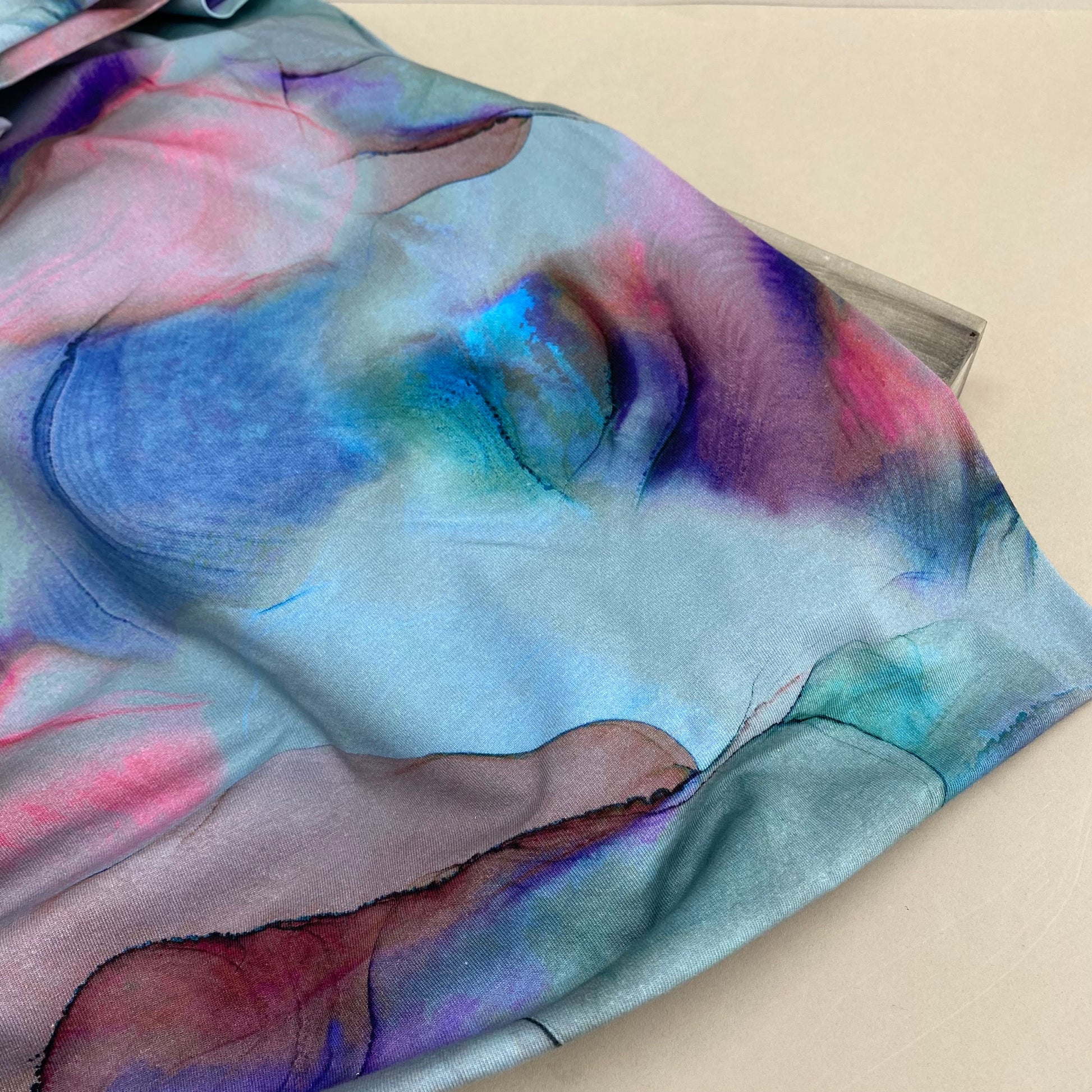 This lovely viscose jersey has abstract palm and blossom patterns on a deep bright blue background. The fabric is super soft with a gorgeous drape and would be perfect for simple t-shirts or a pretty wrap dress.