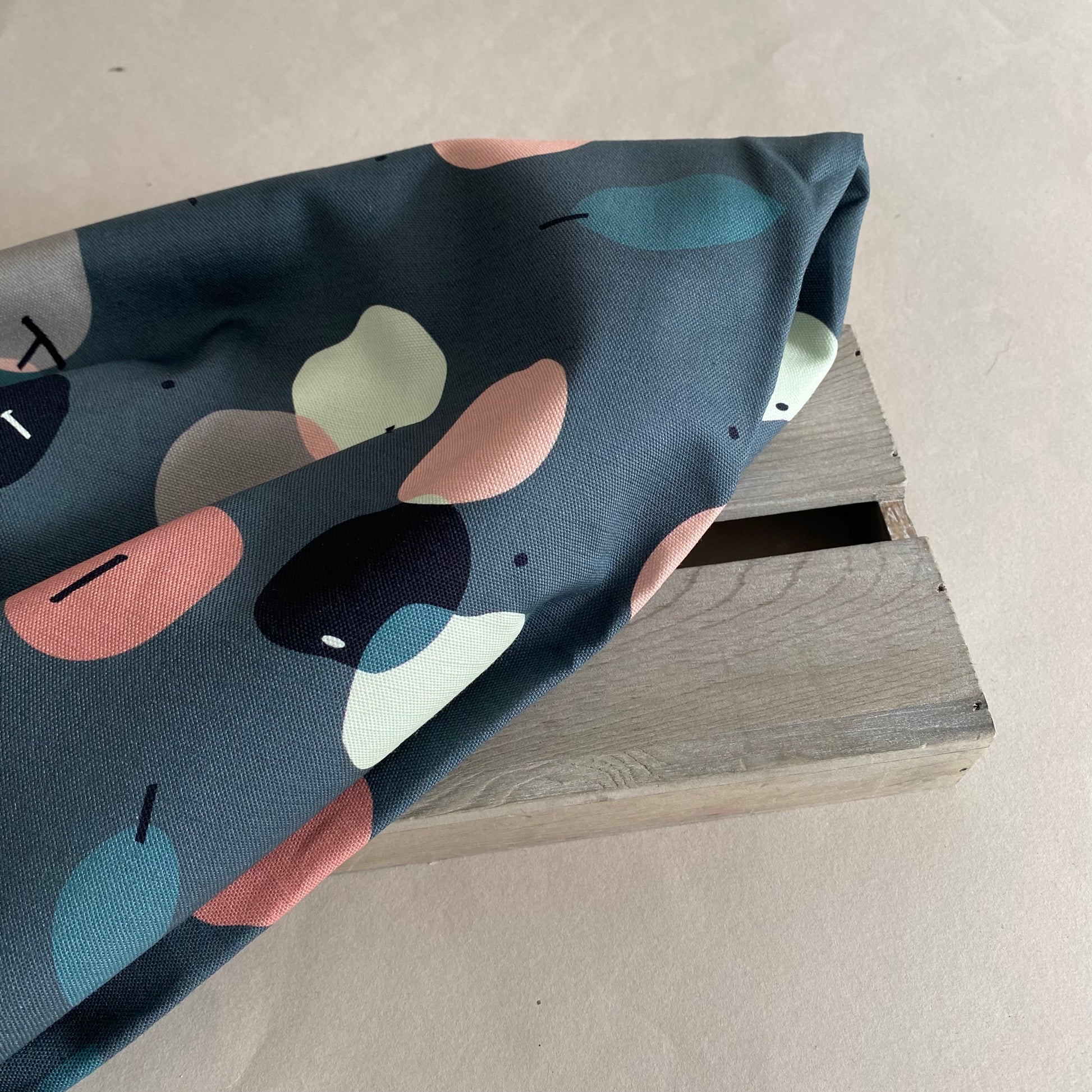 This contemporary linen-cotton blend fabric is from the Hello Heidi Collection. The lovely, playful print captures pastel apples on a dark teal grey base, and would be fantastic for both interior and apparel projects.