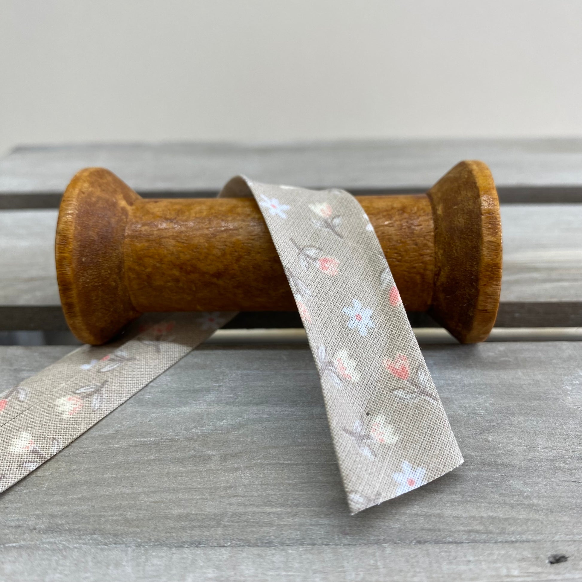 Stunning quality cotton bias binding with a tulip motif on an oatmeal background. Pre-folded for ease of use. Perfect for all dressmaking, interior and accessory projects.