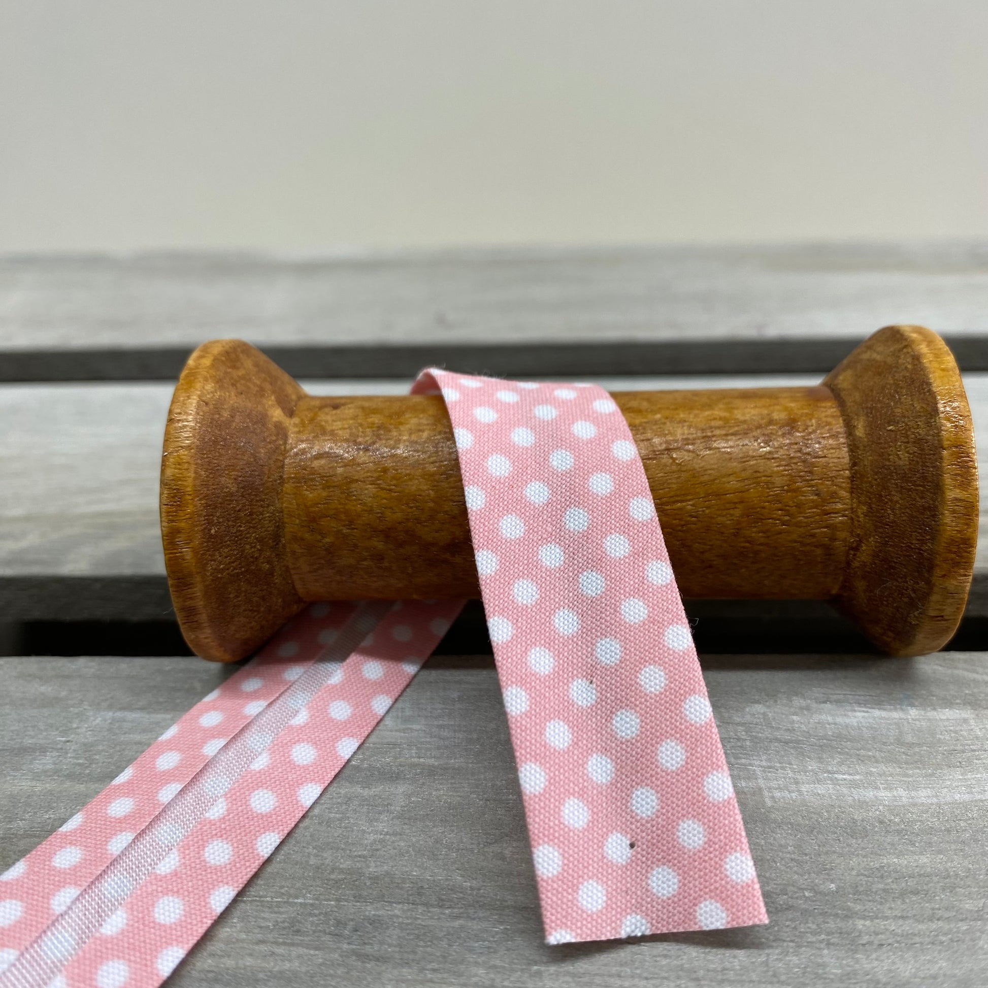 Stunning quality cotton bias binding with a white spot on an pink background. Pre-folded for ease of use. Perfect for all dressmaking, interior and accessory projects.