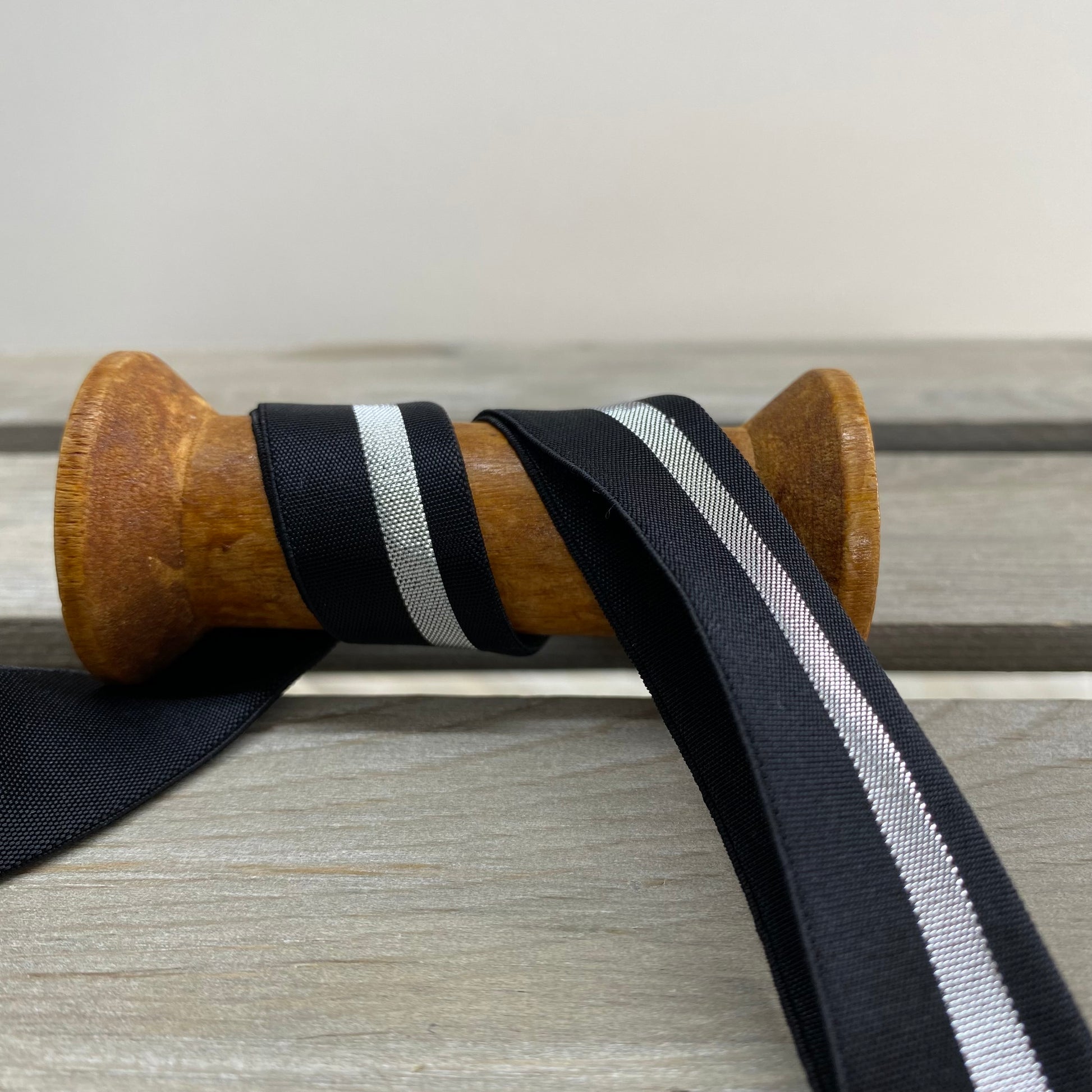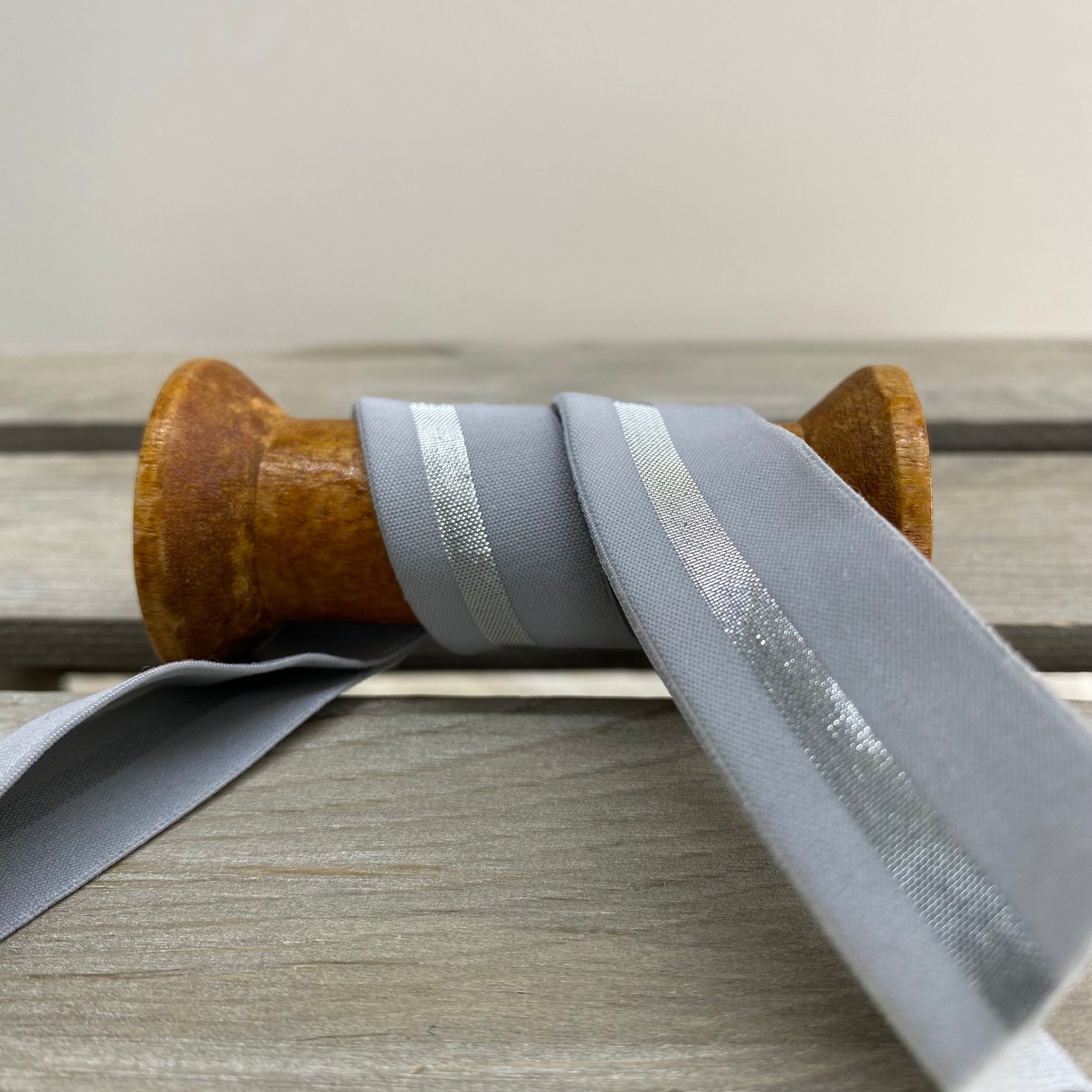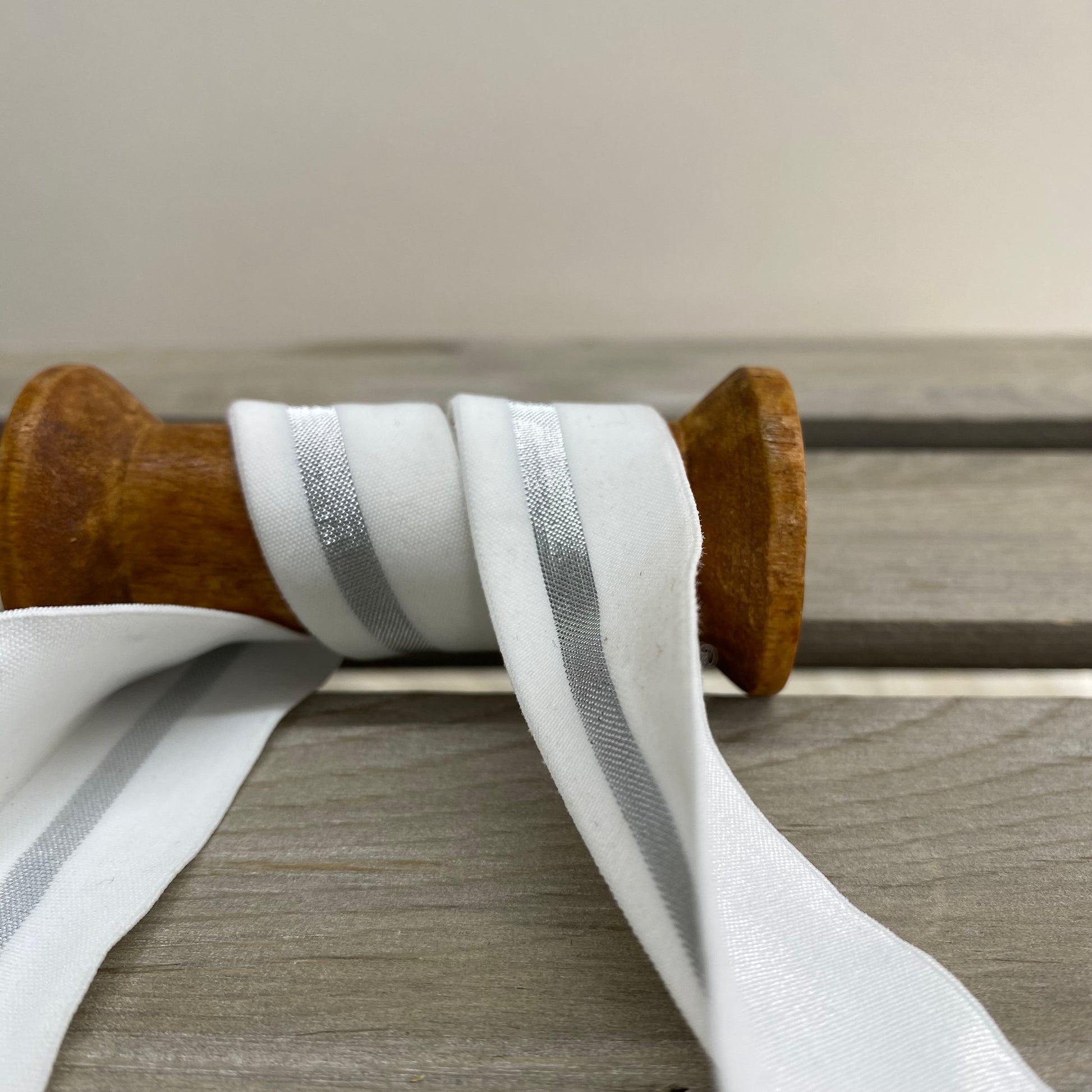 Soft stretch fold over elastic binding with a silver relective strip running along the length.